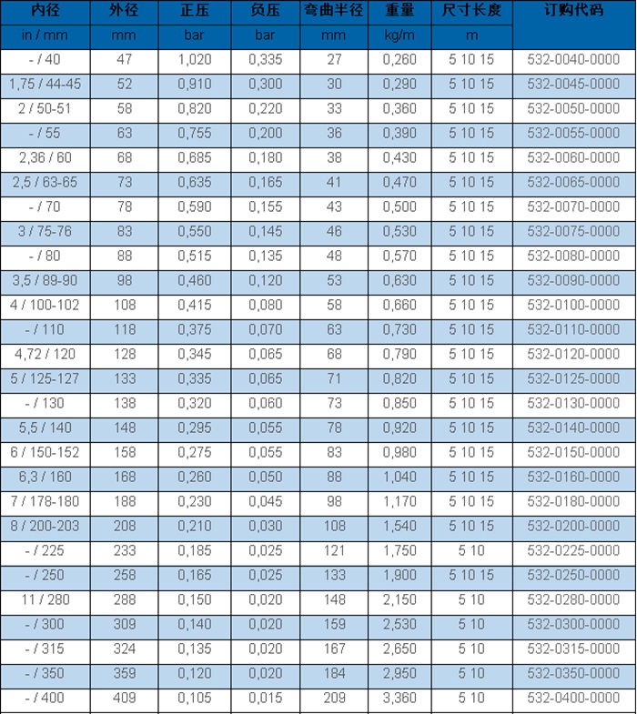 結(jié)構(gòu):彈性鋼絲完整地包覆于管壁,管壁:長久抗靜電優(yōu)質(zhì)聚氨酯(Pre-PUR®),抗木材和木材防腐劑的侵蝕,管壁厚度約為0.6毫米。