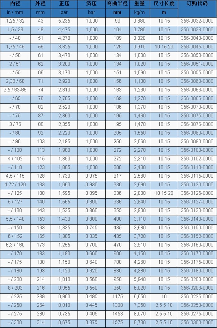 結(jié)構(gòu):彈性鋼絲牢牢地嵌入管壁內(nèi),管壁長久抗靜電聚酯聚氨酯 (Pre-PUR®),管壁厚度約為2.0至2.5毫米,加強易被磨損區(qū)域。