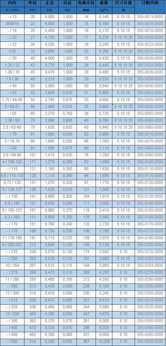 結構:彈性鋼絲牢牢地嵌入管壁內(nèi),管壁長久抗靜電聚酯聚氨酯 (Pre-PUR®),管壁厚度約為1.4 - 1.5毫米