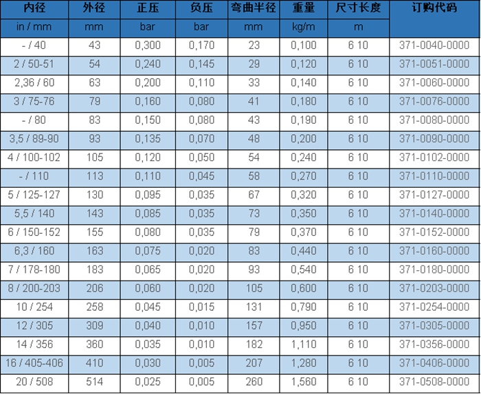 織物加強(qiáng),超輕型,高彎曲性+壓縮比6:1,良好的耐堿及耐酸性能,良好的抗化學(xué)性能