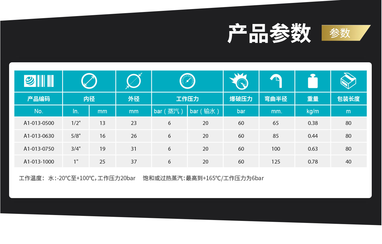 可輸送熱水和高達+165℃的蒸汽,適用于牛奶場、奶制品車間、罐頭廠、水產品市場等工作場合的沖洗.也可用于輸送高溫流體食品,可在卷軸上纏繞。