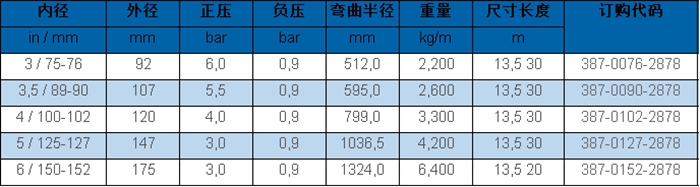 柔性軟管/用于極其磨損性粉體、散裝物料、顆粒和氣體的高吞吐量軟管輸送,真空車,抽吸車,干吸車:工業(yè)清洗,鍋爐清洗,爆炸危險區(qū)域,原料輸送軟管,如粉體,顆粒,砂子,石英,砂石,碎片和刨花,料倉,槽罐車,油罐車:料倉裝卸,木材顆粒、塑料顆粒及塑料粉末輸送